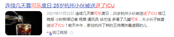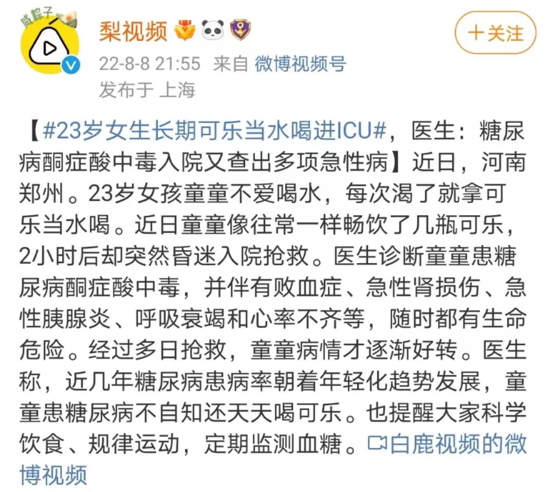 最近,河南郑州23岁的女生童童因长期把可乐当水喝,把自己喝进了ICU。