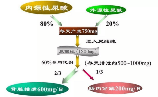 过多摄入高嘌呤食物,可能导致高尿酸,但高尿酸不是都由饮食导致。嘌呤和胆固醇相似,也分为内源协和外源性,内源性嘌呤是自身代谢产生,占总嘌呤的80%,而饮食摄入的外源性嘌呤,只占20%。痛风的病因中,其实尿酸排泄障碍才是大头(尿酸生成增多型10%,尿酸排泄减少型60%,混合型30%),单纯尿酸生成增多的痛风只有极少数。