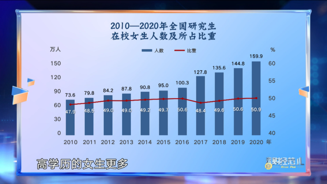 《中国妇女发展纲要(2011—2020年)》终期统计监测报告显示,我国各类高等教育中女生占比均超过男生。
