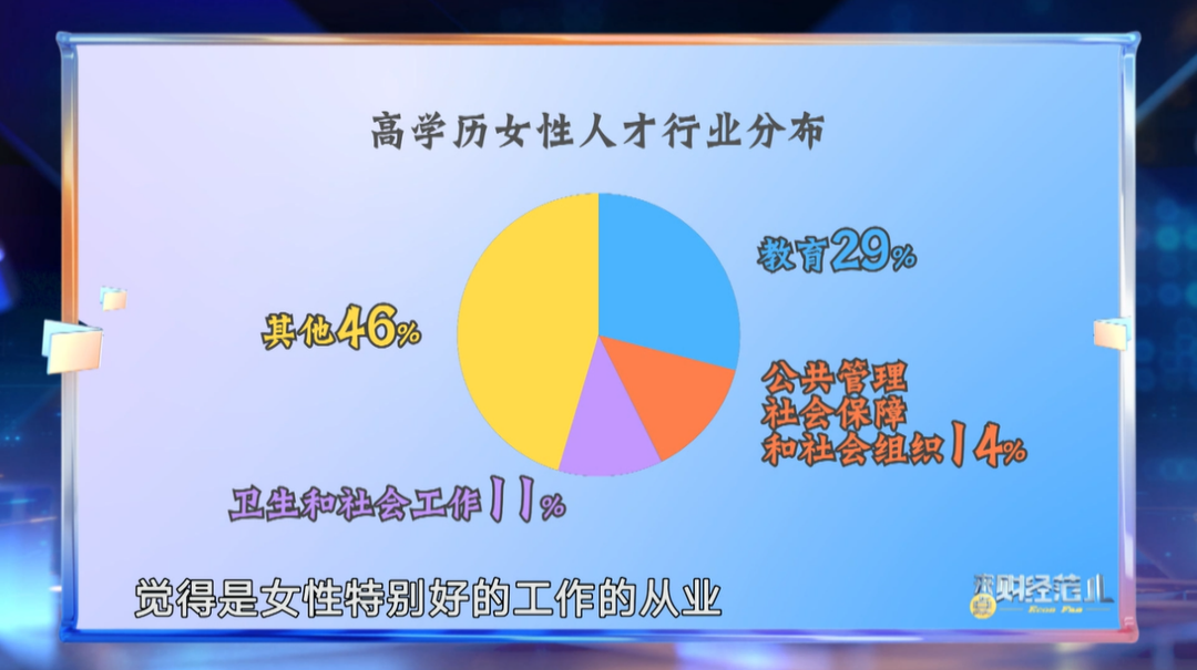 从就业分布看,我国高学历女性人才主要集中在三大行业:教育(29%);公共管理、社会保障和社会组织(14%);卫生和社会工作(11%)。这三个行业加起来占了女性高学历人才的54%。