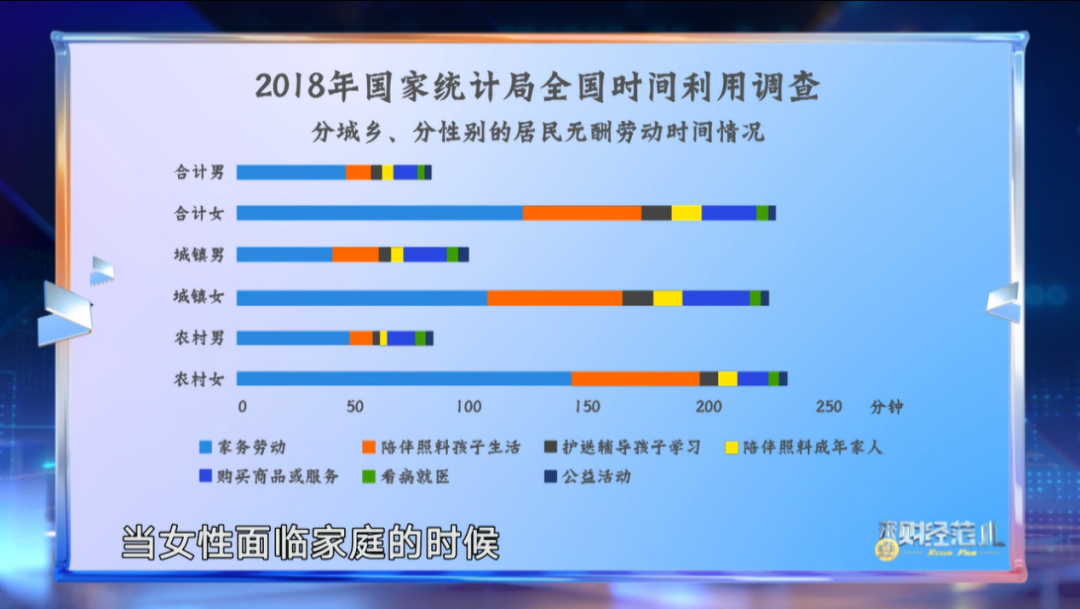 国家统计局每十年进行一次的时间利用调查结果显示,包括家务劳动、陪伴照料孩子生活、护送辅导孩子学习、陪伴照料成年家人、购买商品或服务、看病就医、公益活动在内的居民无酬劳动平均时间,男性为1小时32分钟,女性为3小时48分钟,女性用于生活中无报酬劳动的时间接近男性的2.5倍。