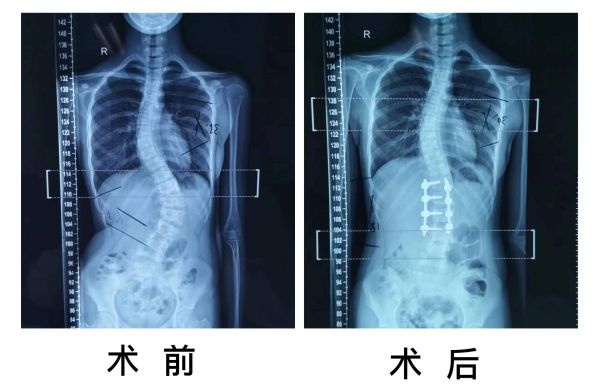 影像检查片上清晰可见,亭亭的脊柱被“拉直”了,背部左右也变得对称了。
