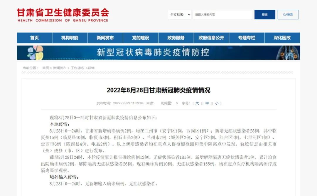 8月28日0—24时,甘肃省新增确诊病例2例,均在兰州市(安宁区1例,西固区1例);