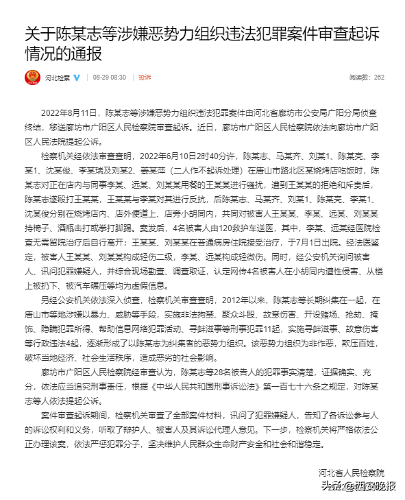 2022年8月11日,陈某志等涉嫌恶势力组织违法犯罪案件由河北省廊坊市公安局广阳分局侦查终结,移送廊坊市广阳区人民检察院审查起诉。近日,廊坊市广阳区人民检察院依法向廊坊市广阳区人民法院提起公诉。
