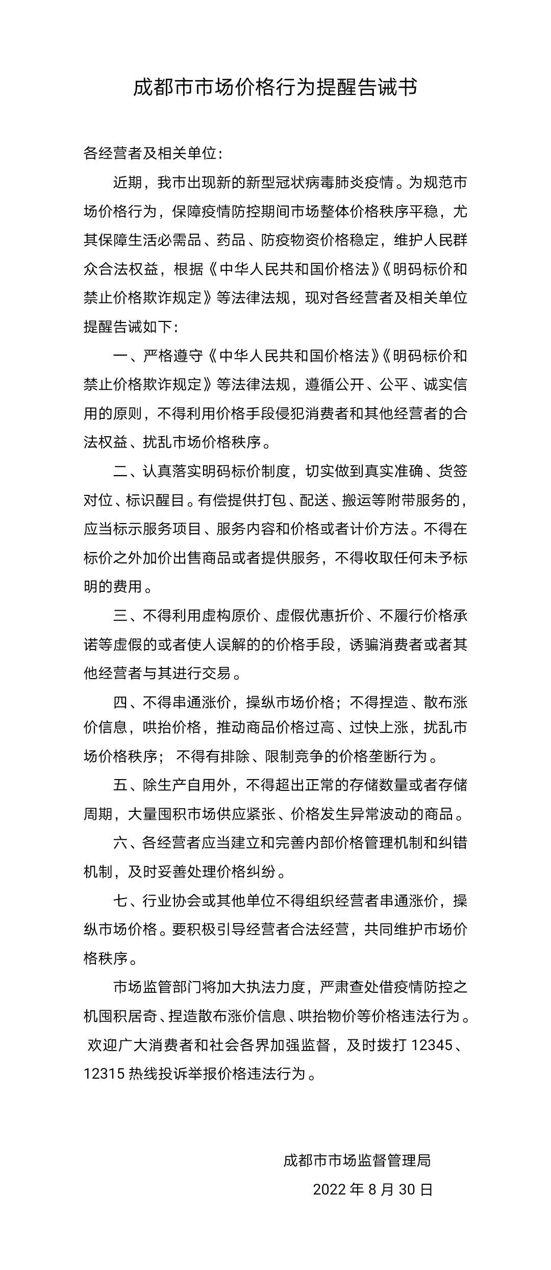 近期,成都出现新的新型冠状病毒肺炎疫情。为规范市场价格行为,保障疫情防控期间市场整体价格秩序平稳,尤其保障生活必需品、药品、防疫物资价格稳定,维护人民群众合法权益,根据《中华人民共和国价格法》《明码标价和禁止价格欺诈规定》等法律法规,成都市市场监管局今天发布市场价格行为提醒告诫书,对各经营者及相关单位提醒告诫。(详情请看图)