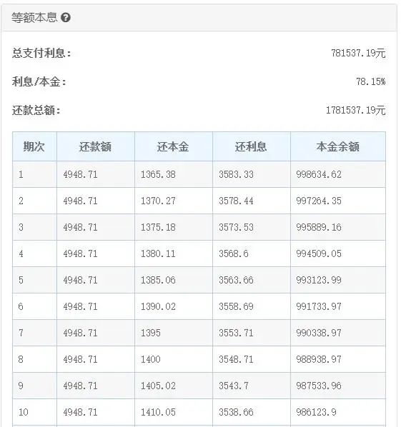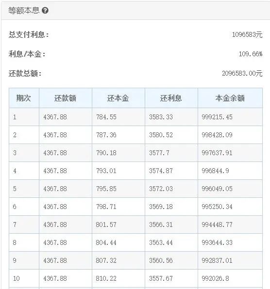 如果按照40年的贷款期限来计算,依旧是等额本息,总支付利息为1096583元,还款总额为2096583.00元,每个月还款4367.88元,也就是说,虽然贷款年限增加了10年,但总支付利息也在增加,增加了315045.81元,而每个月的还款金额也仅仅是减少了580.83元。