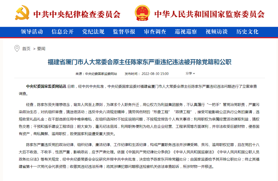 日前,经中共中央批准,中央纪委国家监委对福建省厦门市人大常委会原主任陈家东严重违纪违法问题进行了立案审查调查。