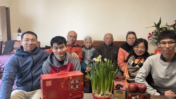 祖孙三代校友同框:左五为爷爷,右三为姑妈,右一为黄思皓。 (拍摄于2020年春节)