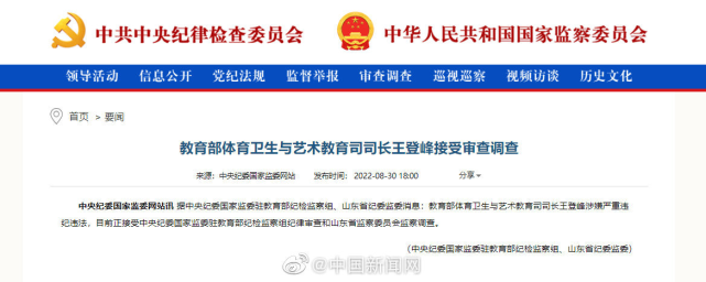 据中央纪委国家监委驻教育部纪检监察组、山东省纪委监委消息:教育部体育卫生与艺术教育司司长王登峰涉嫌严重违纪违法,目前正接受中央纪委国家监委驻教育部纪检监察组纪律审查和山东省监察委员会监察调查。