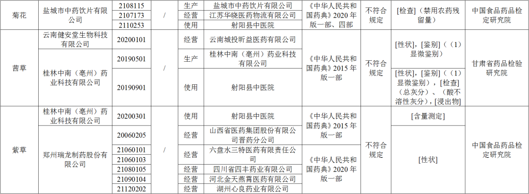 ● 经中国食品药品检定研究院检验,标示为盐城市中药饮片有限公司生产的3批次菊花不符合规定,不符合规定项目为禁用农药残留量。