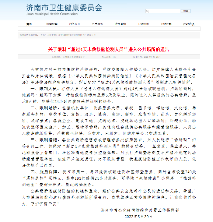 今天,记者从济南市常态化疫情防控和处置工作指挥部获悉,为有效应对当前疫情防控严峻形势,严防疫情输入传播风险,切实保障人民群众生命安全和身体健康,根据《中华人民共和国传染病防治法》《中华人民共和国治安管理处罚法》等法律法规和有关规定,济南市即日起对“超过4天未做核酸检测人员”限制进入有关场所。