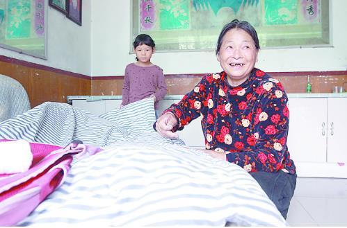 博爱县寨豁乡江岭村的王玉梅在为自己的孙女缝被子。