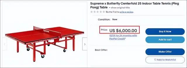 有趣的是,美国潮流服饰品牌Supreme去年年底曾经推出一款大红色加品牌标识的乒乓球桌,恰好可以与路易·威登的乒乓球套装搭配。如今这款乒乓球桌在美国跨境电商网站eBay上售价也高达6000美元(约合人民币4.15万元)。
