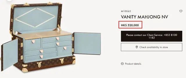 实际上,LV近年来推出过不少跨界单品,都是价格昂贵。比如在2021年推出的浅蓝色内饰的麻将箱,仅包括一套LV设计的麻将,一只采用经典深棕色印花图案及金属构件的箱子,售价高达52万港币(约合人民币45.8万元)。
