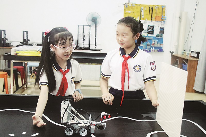 创意有了,那如何制作呢?自动喷洒消毒液机器人所需的超声波传感器等材料,学校就可以提供。制作初期,阴韵曈独自编程一段时间后感觉有一些困难,她意识到需要依靠团队去作战。“我们两个的学习方向并不一样,阴韵曈擅长乐高编程,我擅长计算机软件编程,在研发过程中我们分工合作,又可以做到优势互补,两个人的想法还会碰撞出新灵感。”赵佳然说。