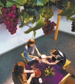 眼下正是葡萄成熟的季节,在东城区花市社区博物馆的一处葡萄架下,两位奶奶和一位小姑娘正玩着一串“葡萄”。这“葡萄”原来是用玻璃做的工艺品。出自京城手工艺圈子里独树一帜的“葡萄常”之手。其中一位老人就是国家级非物质文化遗产“葡萄常”第五代传承人常弘,她和妹妹常燕一起为孙女常开心讲解做“葡萄”的技法。