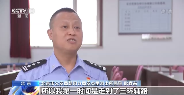 北京市公安局朝阳分局安贞里派出所民警 耿春东:他(报警人)讲了一个很关键的,就是三环辅路,所以我第一时间是走到了三环辅路,当时我在巡逻,离三环辅路比较近,第一时间大概用了三分多钟不到四分钟就赶到了现场。