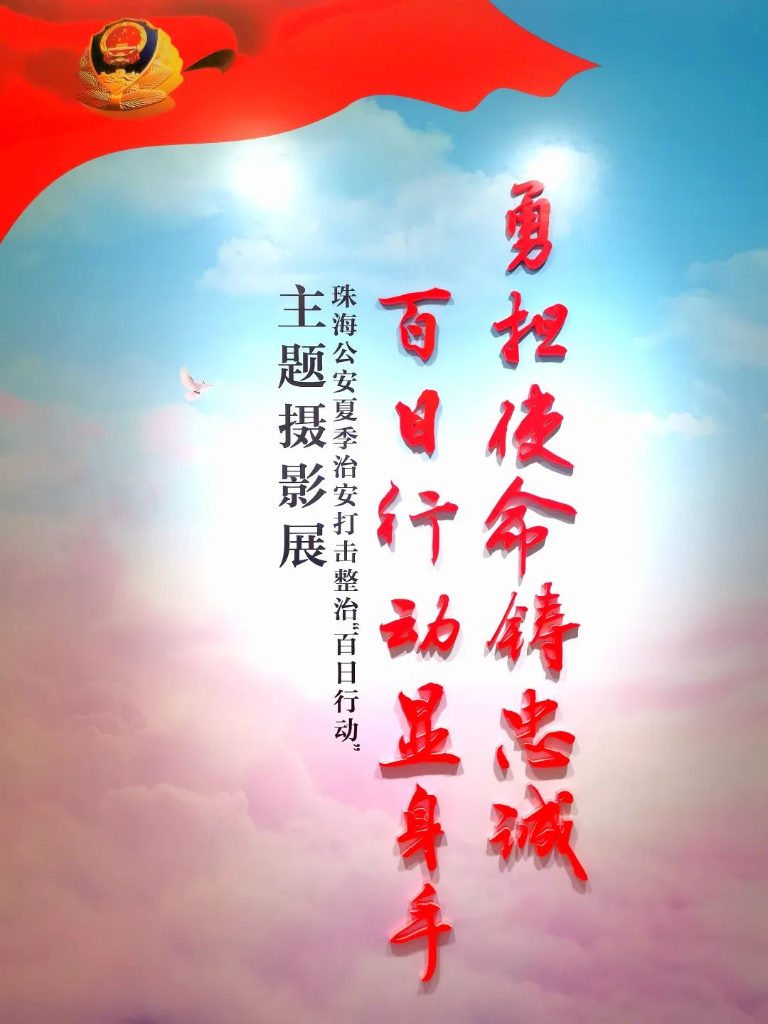 近日,珠海市公安局在市局指挥大楼一楼大厅隆重举办“勇担使命铸忠诚 百日行动显身手——珠海公安夏季治安打击整治‘百日行动’主题摄影展”。这些摄影作品都是珠海公安文联的摄影骨干们扛着“长枪短炮”,投身一线,聚焦现场,用镜头定格的一个个精彩瞬间,用光影生动讲述的珠海公安奋战“百日行动”的感人故事。