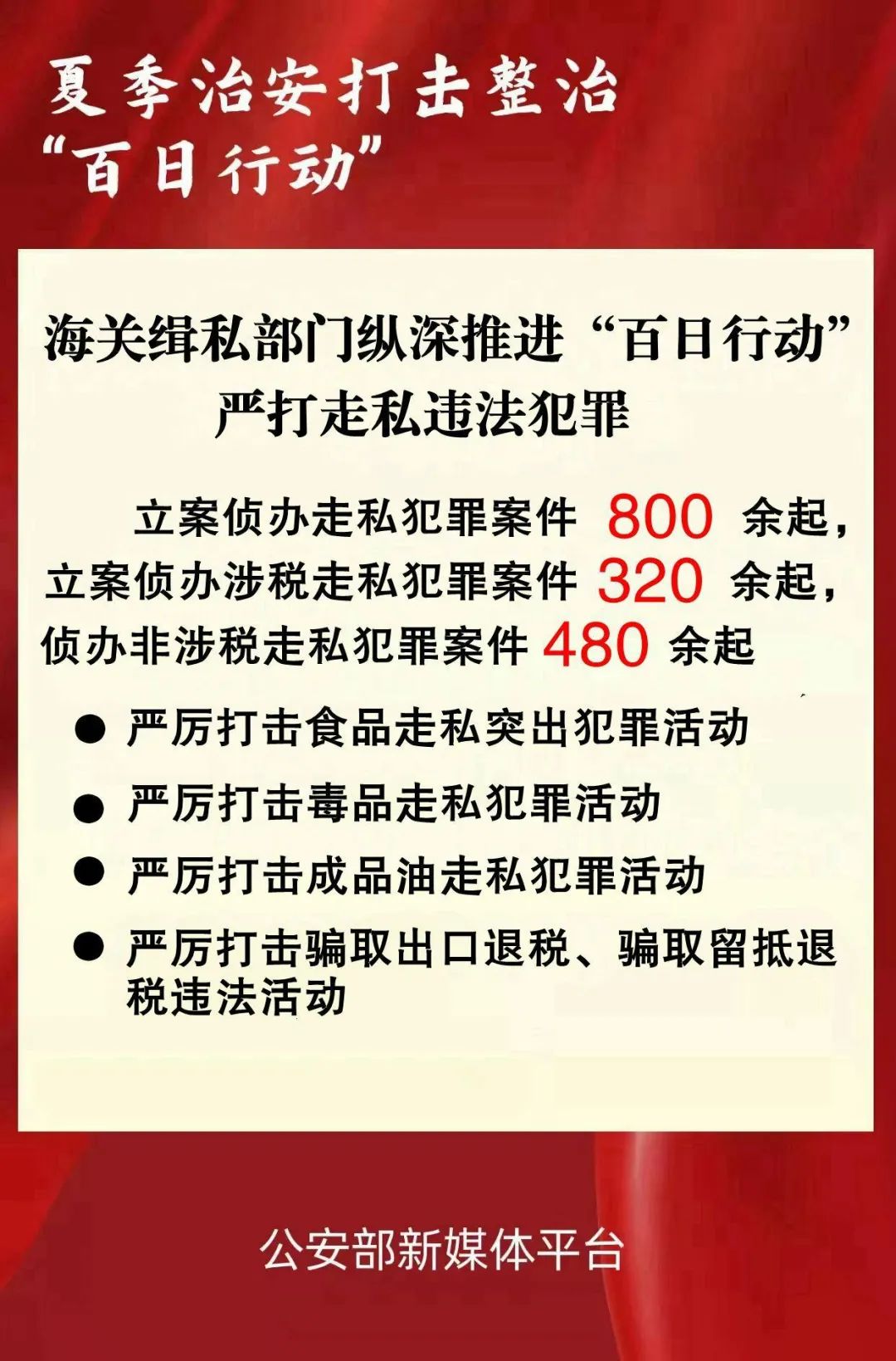 海关总署缉私局负责人表示,全国海关缉私部门将持续纵深推进“百日行动”,始终保持打击走私高压态势,联合协同各警种各部门深挖彻查走私关联犯罪,以实实在在的打私成绩切实维护国家安全和群众利益。