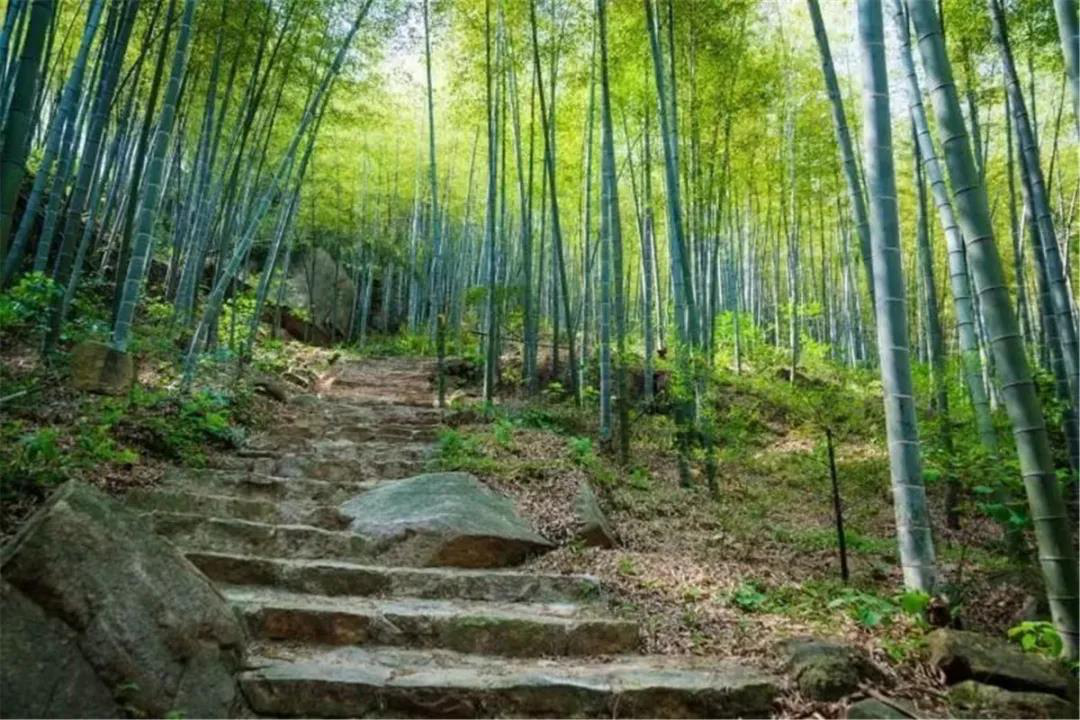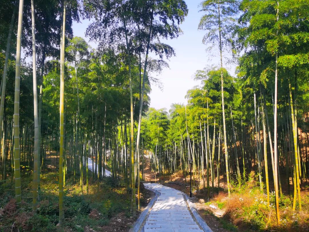 在古道的最高处有一座“凌顶远眺台”,站在台上可尽揽千亩竹海、乡村人家,景色十分秀美。