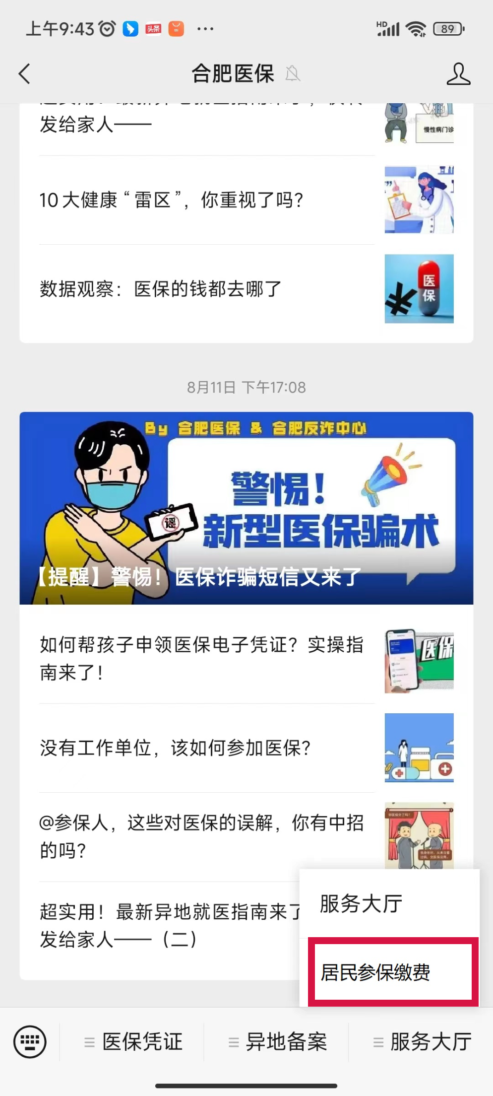 第一步 关注“合肥医保”公众号,进入公众号后点击服务大厅-城乡居民参保缴费,进入居民参保界面。