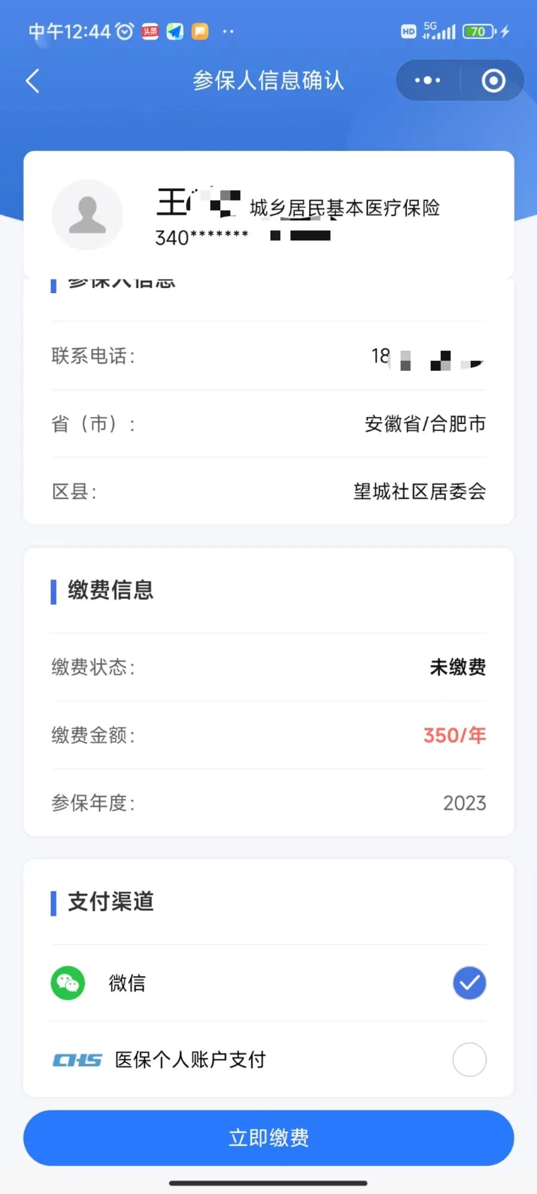 第二步 选择对应的参保年度进入缴费界面后,在缴费界面输入参保人身份证号,点击参保缴费进入参保信息确认界面,信息确认无误选择支付渠道后,点击立即缴费,提示支付成功即参保缴费成功。