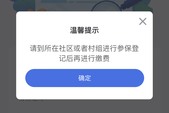 缴费时如果遇到下图提示,请到社区或者村组参保缴费窗口进行参保登记。