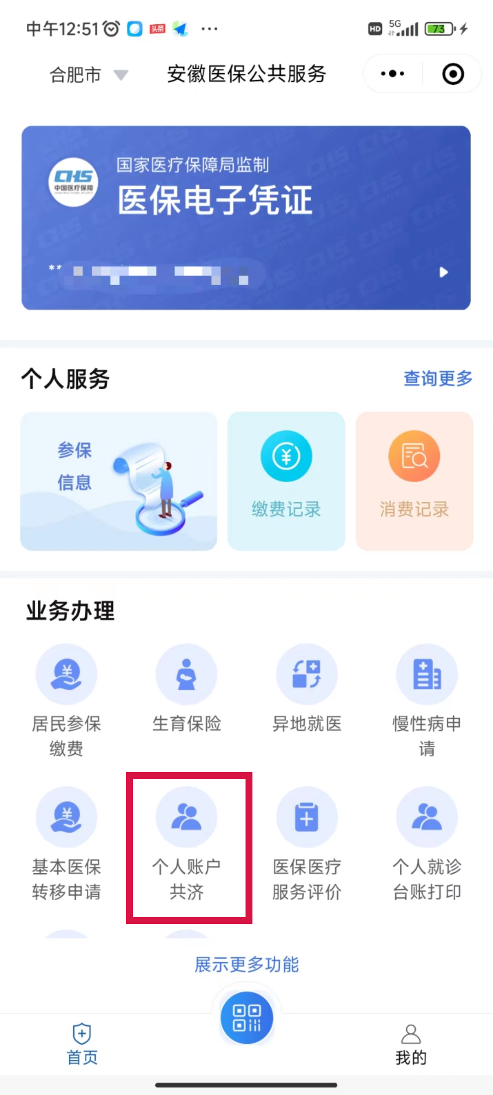 第一步:职工医保参保人在“合肥医保”公众号点击服务大厅进入“安徽医保公共服务”小程序,选择左上角本人职工医保的参保地,点击“个人账户共济绑定”。