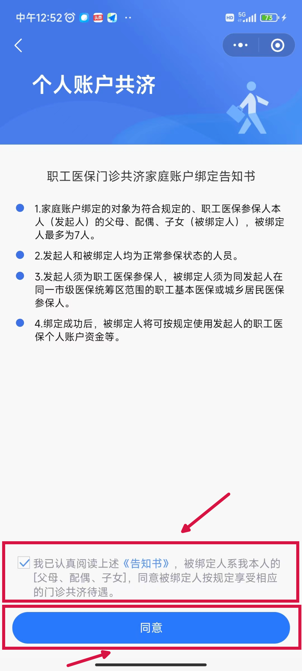 第二步:界面弹出《职工医保门诊共济家庭账户绑定告知书》,请认真阅读后,在方框格中点击勾选,再点击同意,进入下一界面。