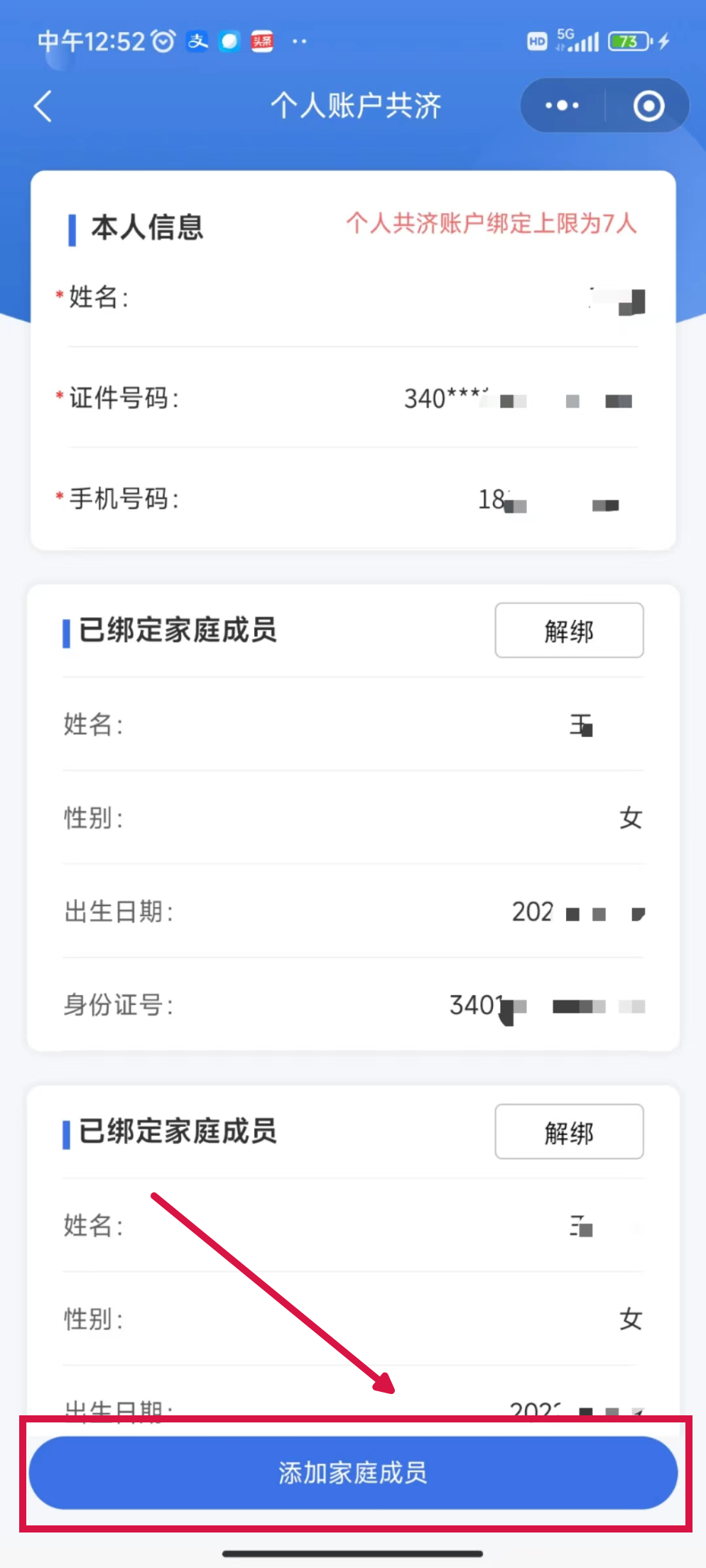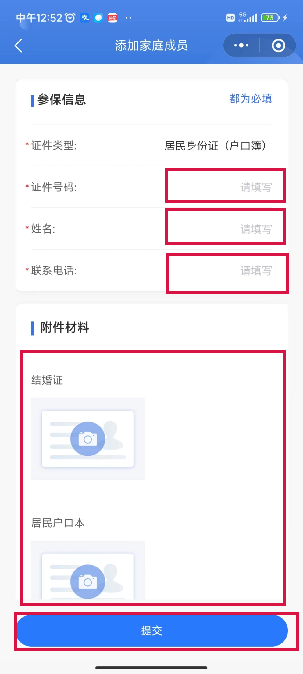 第三步:在界面点击添加家庭成员,弹出界面,输入配偶、父母、子女的证件号码、联系电话(系统自动查询该证件号码对应的参保人姓名),上传结婚证、居民户口簿等证明资料,核对无误后,点击提交,完成绑定。