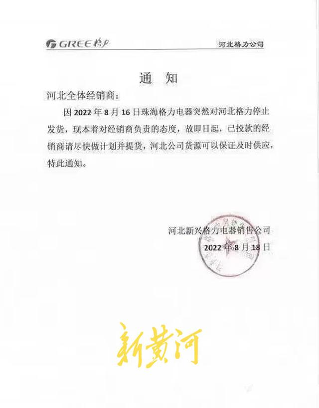 近期,话题“格力电器停止对河北经销商供货”登上热搜。风波来自于一张网传图片。2022年8月18日,原格力电器河北总经销商——河北新兴格力电器销售公司(以下简称“河北新兴格力”)向格力河北全体经销商发布通知称,因2022年8月16日珠海格力电器突然对河北格力停止发货,现本着对经销商负责的态度,即日起,已投款的经销商请尽快做计划提货,河北公司货源可以保证及时供应。
