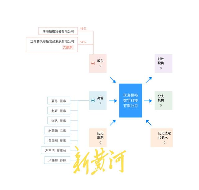 珠海桓格的大股东江苏赛夫绿色食品发展有限公司(以下简称“江苏塞夫绿色食品”)持股51%,珠海桓格贸易有限公司持股49%。江苏赛夫绿色食品成立于2016年4月6日,法人也是左玉洁,大股东为江苏赛夫贸易有限公司。刘强东和章泽天曾是江苏赛夫绿色食品和江苏塞夫贸易有限公司的股东,于2020年8月从这两家公司中退股。刘强东间接持股的润京信息科技(江苏)有限公司中,左玉洁也在该公司担任董事长,江苏赛夫绿色食品是大股东。