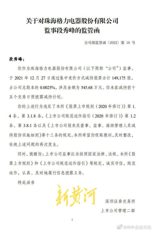 不过,段秀峰与格力的关系一直未彻底切断。2022年1月,因违规减持近15万股,深交所向格力电器监事段秀峰发出监管函。2022年2月,格力电器监事会换届,段秀峰仍被选为格力第十二届监事会非职工代表监事。