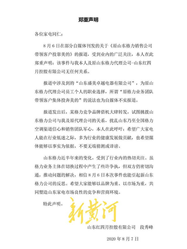 2020年8月,部分自媒体发布《原山东格力销售公司带领客户投靠美的》,段秀峰发布公开声明表示,该事件与他本人及山东格力代理公司——山东红四月无关。值得注意的是,声明最后指出,山东格力近半年来的变化,受到行业内密切关注。虽格力业务主体在切换过程中产生些许整治,但双方仍密切沟通,推动问题解决,相信此次事件也能引起新山东格力公司的反思。