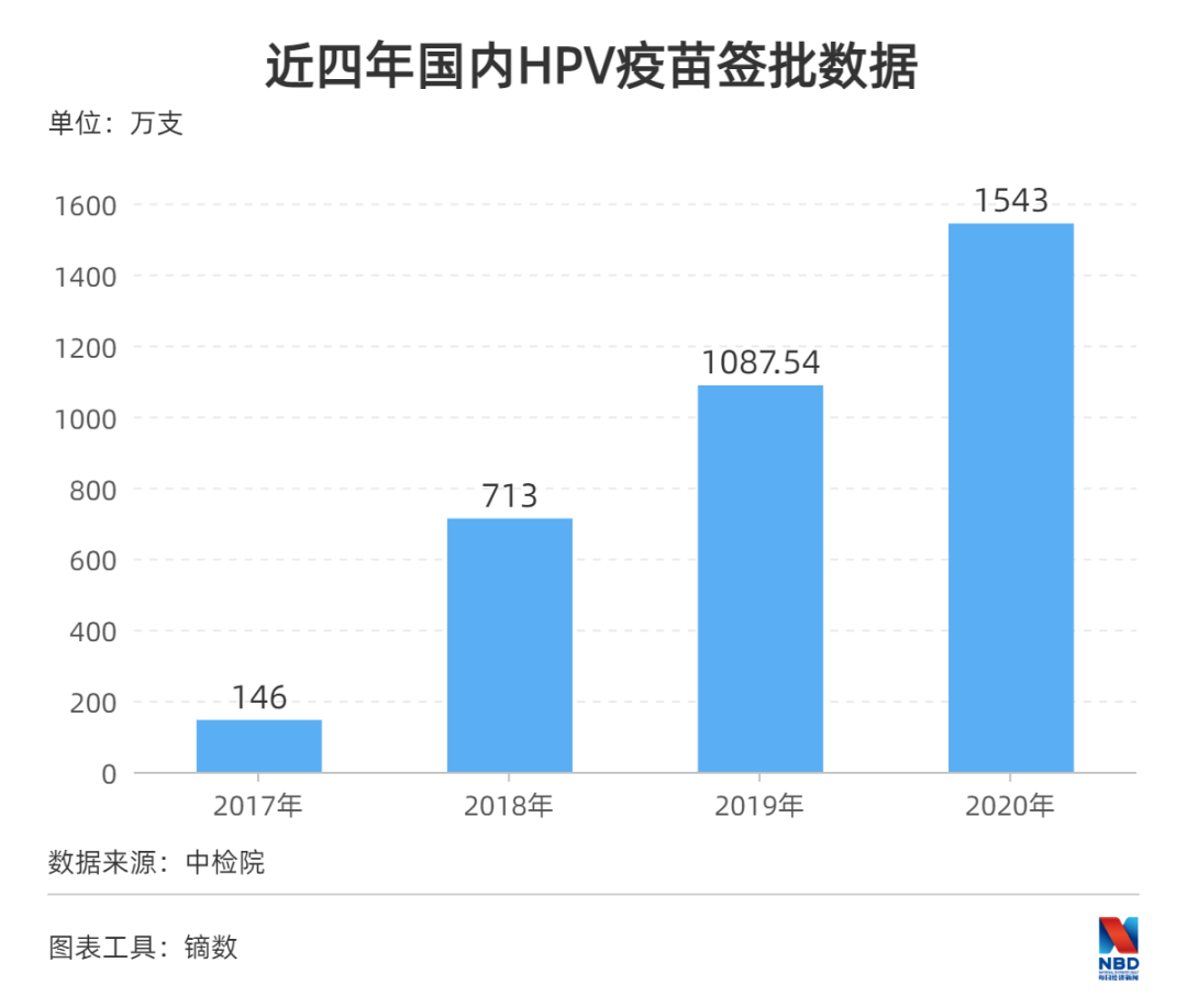 中检院数据显示,2017年我国HPV疫苗的签发量为146万支;2018年为713万支;2019年达到1087.54万支。2020年全年,HPV疫苗合计获得批签发1543万支,其中4价和9价各自批签发约722万支、50万支,同比涨幅分别达到36%、52%。据远川商业评论报道,2020年10月,在深圳市一轮针对HPV九价疫苗的申请中,有20多万人竞争8000余支疫苗,中签率仅为4%。