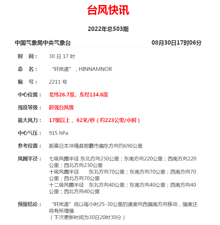 30日早晨5点,其中心位于日本冲绳县那霸市偏东方向大约1060公里的西北太平洋洋面上,就是北纬27.0度、东经138.3度,中心附近最大风力有16级(55米/秒),中心最低气压为930百帕,七级风圈半径180-250公里,十级风圈半径70-80公里,十二级风圈半径50公里。
