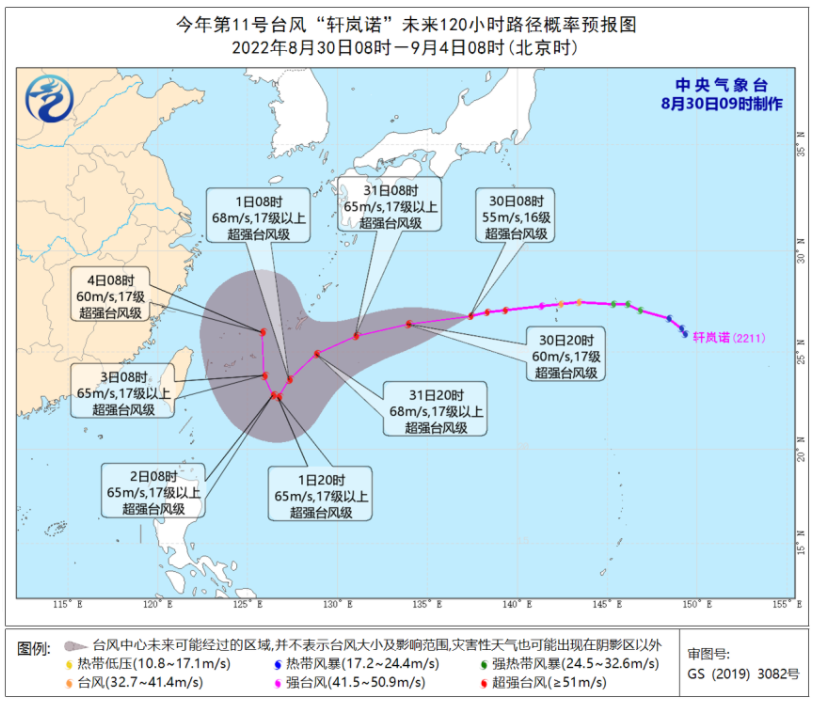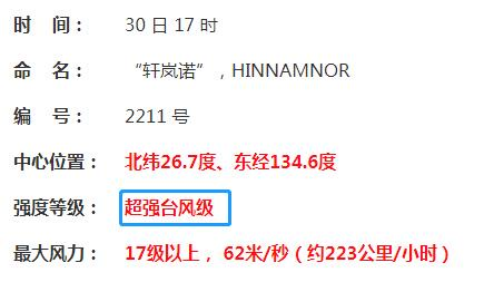 预计,“轩岚诺”将以每小时30公里左右的速度向偏西方向移动,强度继续加强,最强可达超强台风级(58-65米/秒,17级及以上),并逐渐向琉球群岛南部海域靠近,于31日白天开始影响我国东部海域。