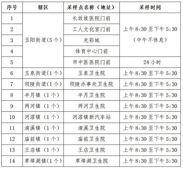 1.五个常态化免费采样点采样时间调整。长坂坡医院、体育中心、工人文化宫、光彩城核酸采样点采样时间调整为8:30-17:30(中午不休息);市中医医院提供24小时核酸采样服务。