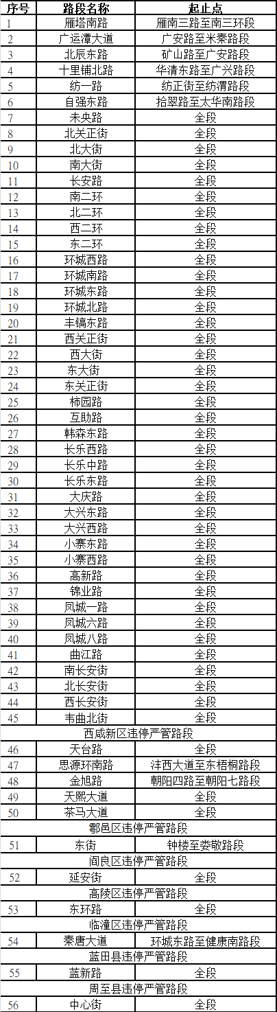 三、 为进一步规范全市停车秩序,保障道路畅通,西安公安交警确立了我市第一批56条违法停车严格管理路段向社会公布。请广大市民朋友文明有序停车,严禁乱停乱放。严管路段,将加强勤务布防和拖车值守,对乱停乱放车辆堵塞交通的,严格依法纠处、拖移。