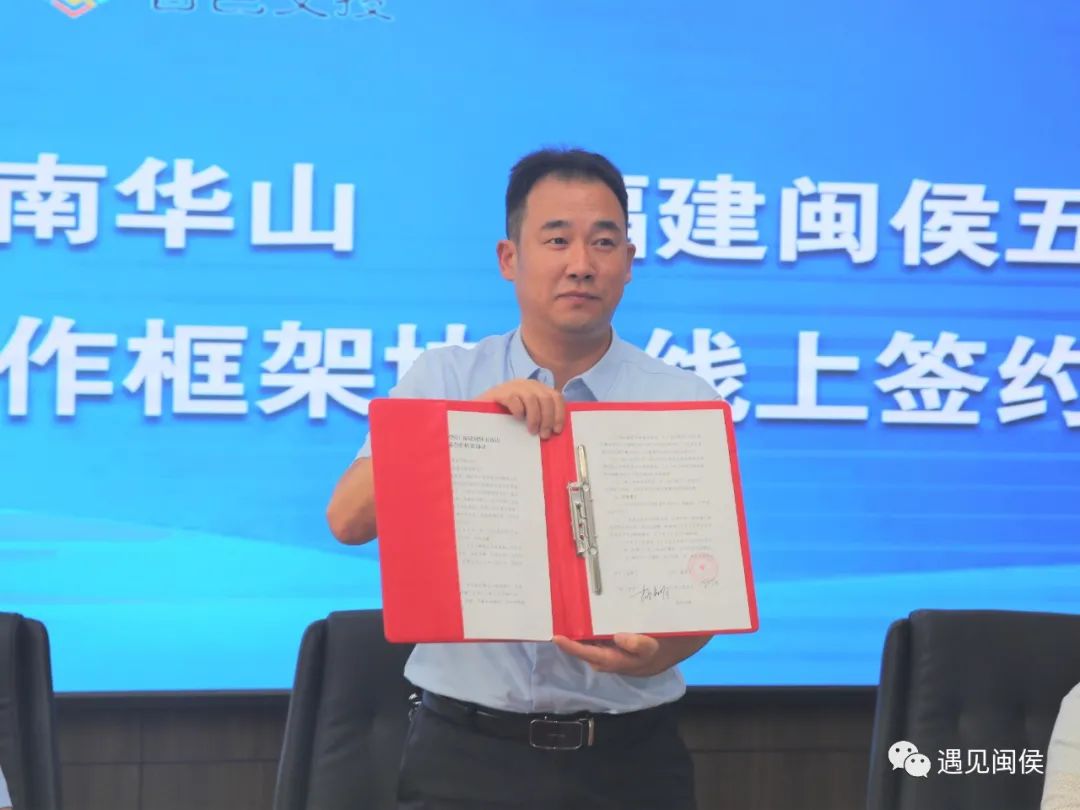仪式上,陕西华山旅游集团总经理助理、党政办主任郝林,五虎山国家森林公园管委会主任林治根分别介绍华山、五虎山基本情况。随后,福州首邑文化旅游投资有限公司代表林阳与陕西华山旅游集团代表杨光明共同签署了《陕西渭南华山 福建闽侯五虎山文旅合作框架协议》。