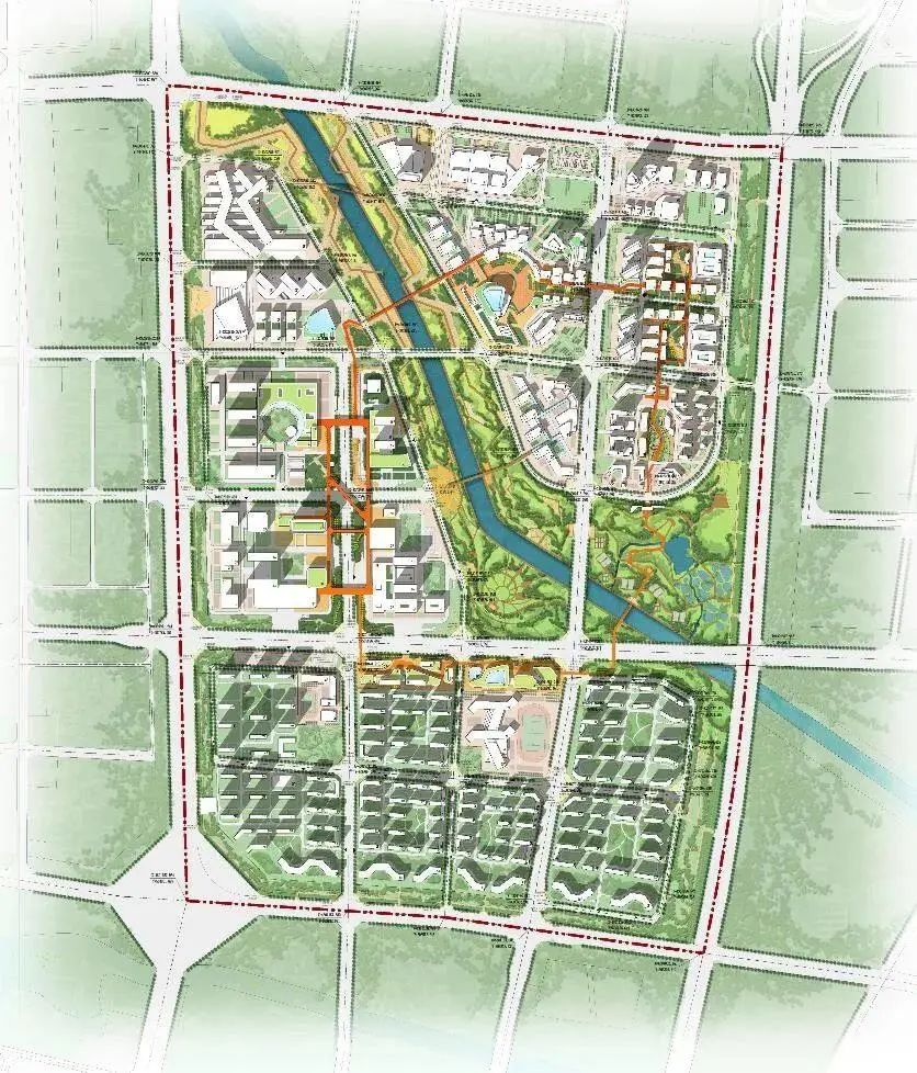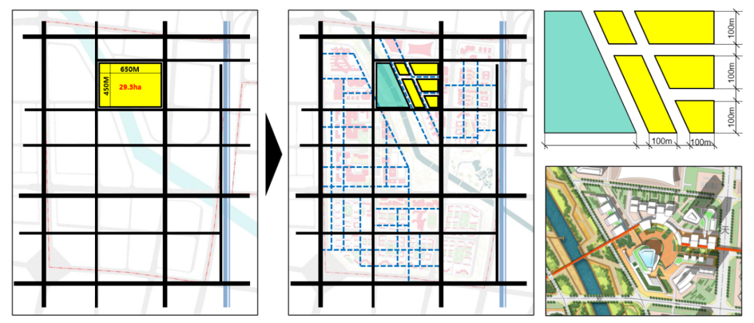 用地层面:用地块内部路和开敞空间进一步切分地块大小,形成疏密有致的建筑布局。