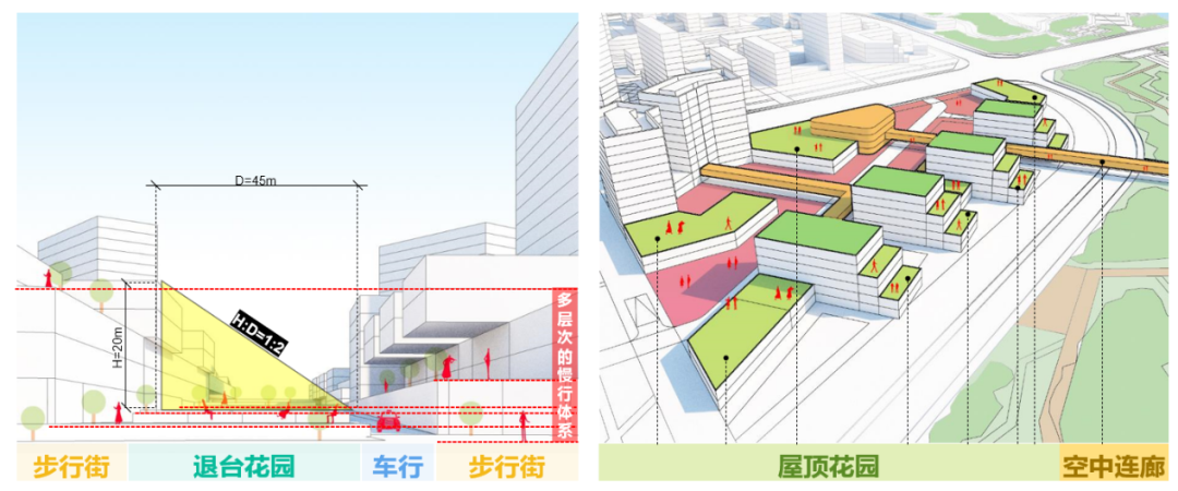 街道层面:控制建筑高度与街道的高宽比与第五立面形式,形成良好的街道步行空间体验。