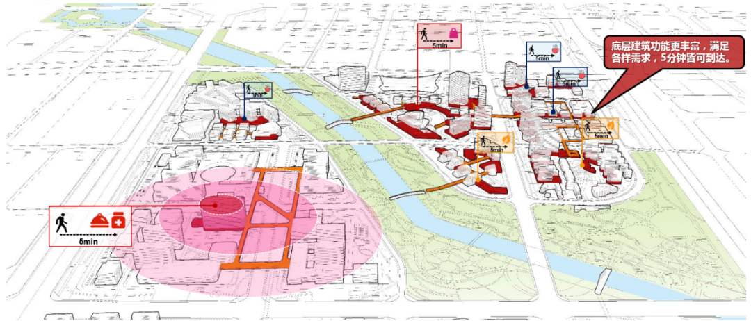 复合化的使用功能:丰富变化的建筑底层功能、立体高效的建筑垂直空间,满足就近需求。