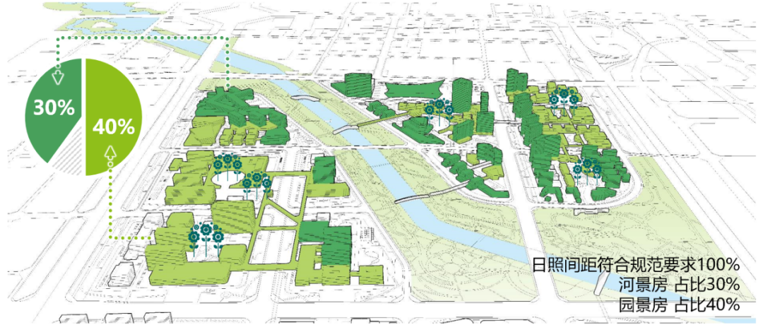 建筑的景观朝向:合理组合建筑布局,塑造更优质的建筑观景视线,实现窗窗有景,户户见绿。