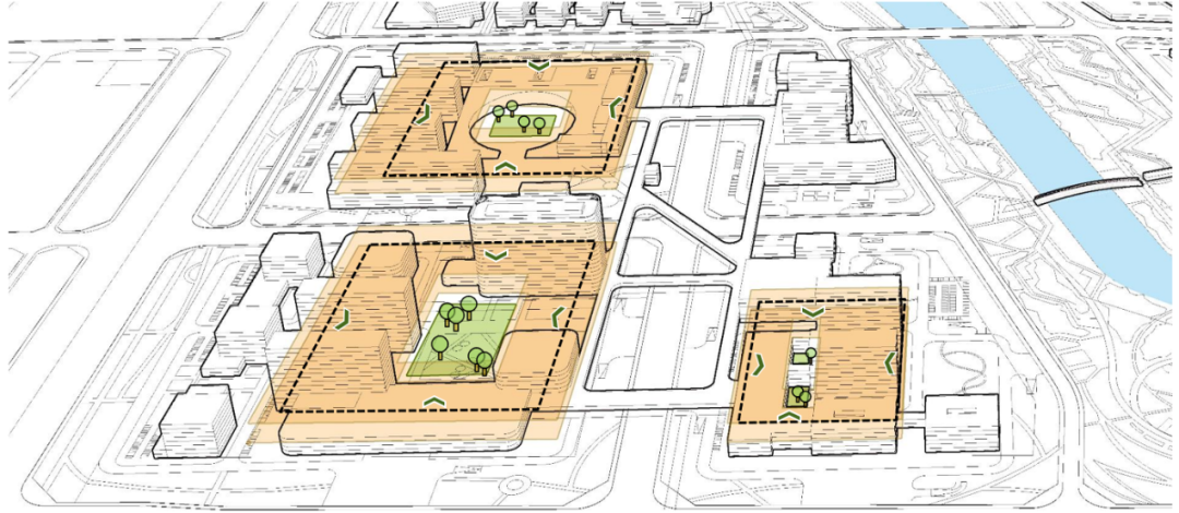 共享医技——扁平化的功能布局组合可以大幅提升医诊效率,各门诊楼与医技楼围绕共享医技中心集中布置;院落围合式的建筑布局可以塑造出更高品质的医诊环境,也有利于楼宇级别的智慧化管理;立体联通的健康廊桥作为线性空间,将几家医疗机构串联成一个空间整体。