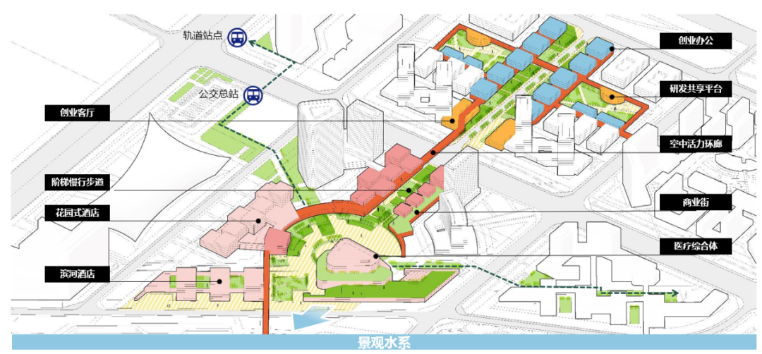 景观化的标识语汇:围绕主要界面与通道,布置具有独特标识的地标建筑,实现区域景观识别。