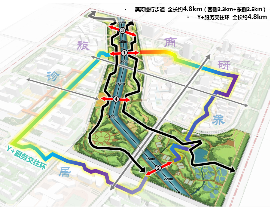 拓展工程堤岸两侧的带状景观游憩空间,增设步行路径与步行桥,实现跨河串联。