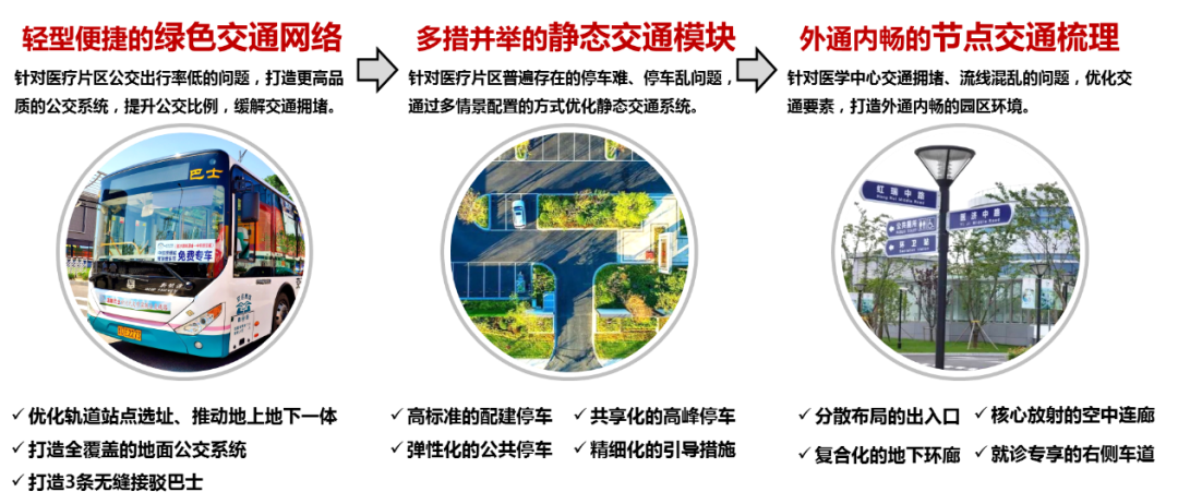 通过“整体网络——重要模块——关键节点”的全系统优化,打造轻型便捷的绿色交通网络、构建多措并举的静态交通模块、以及梳理外通内畅的节点交通。