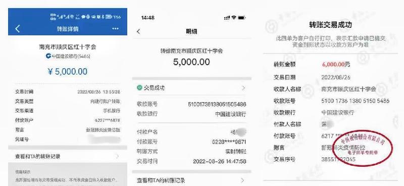 8月26日,南充侨商企业四川求实税务所有限公司郭怀勇,侨商企业兴龙华亚办公家具公司,市区政协委员、侨联委员庞钧月所在单位南充市第十中学校各捐款5000元,柬埔寨川渝总商会会长蒲强捐款6000元。