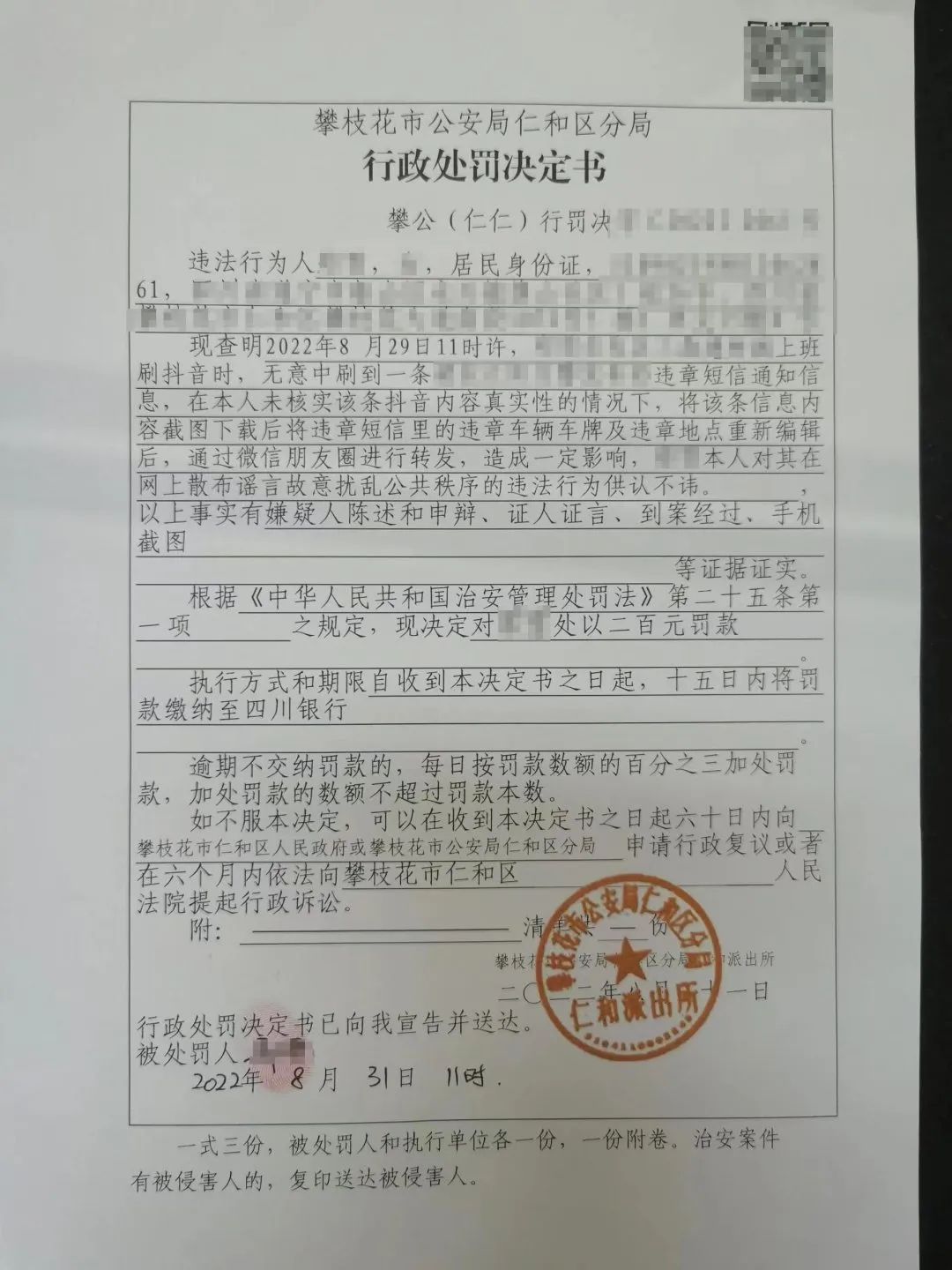 因郑某本人到案后如实供述,并配合警方删除不实信息,在微信朋友圈发布道歉声明,主动消除影响,按照《中华人民共和国治安管理处罚法》第二十五条之规定,郑某因虚构事实,散布谣言扰乱公共秩序,攀枝花市公安局仁和区分局依法对违法行为人郑某处以治安罚款200元。